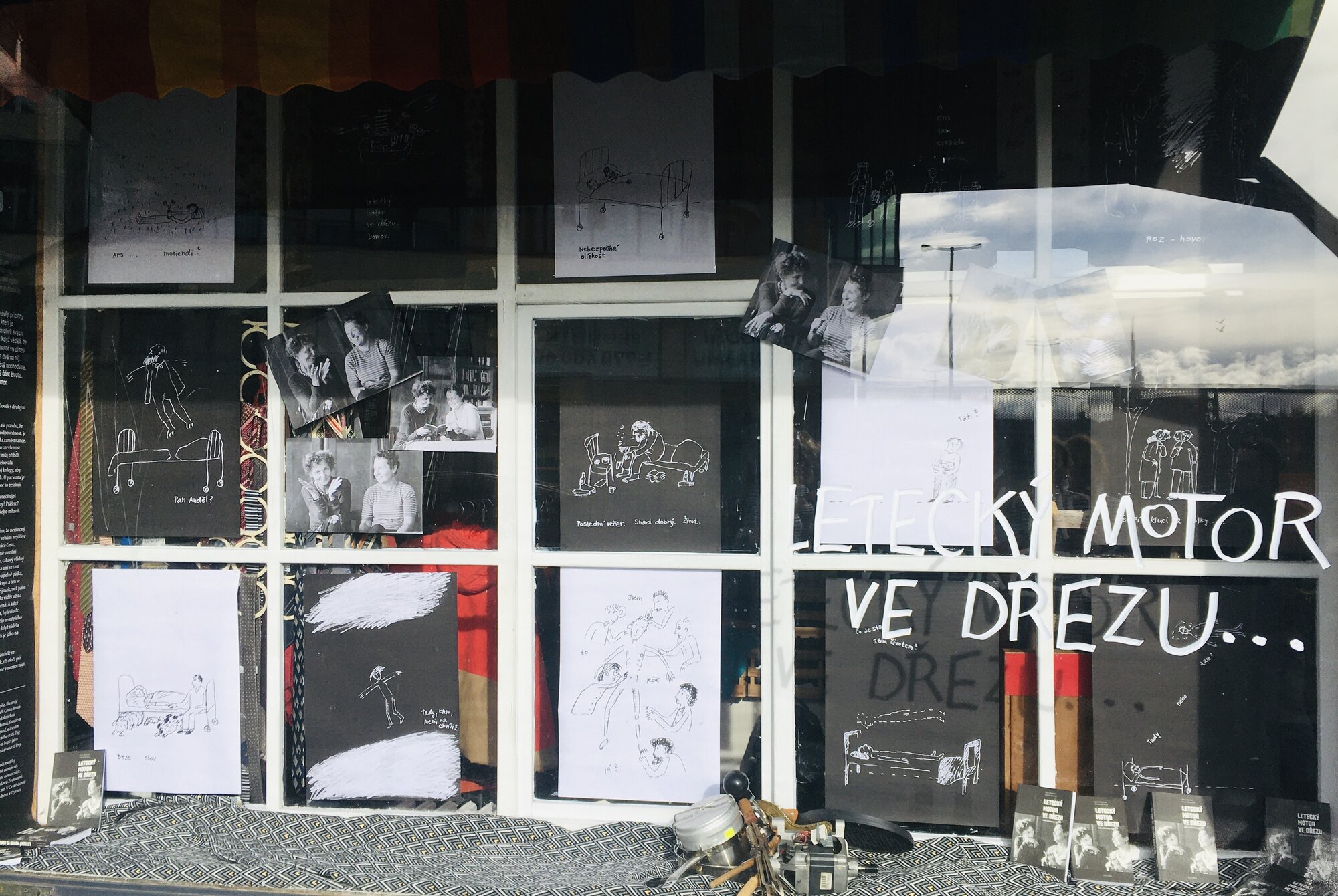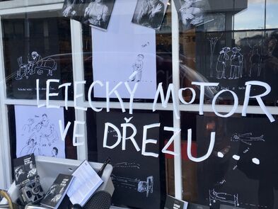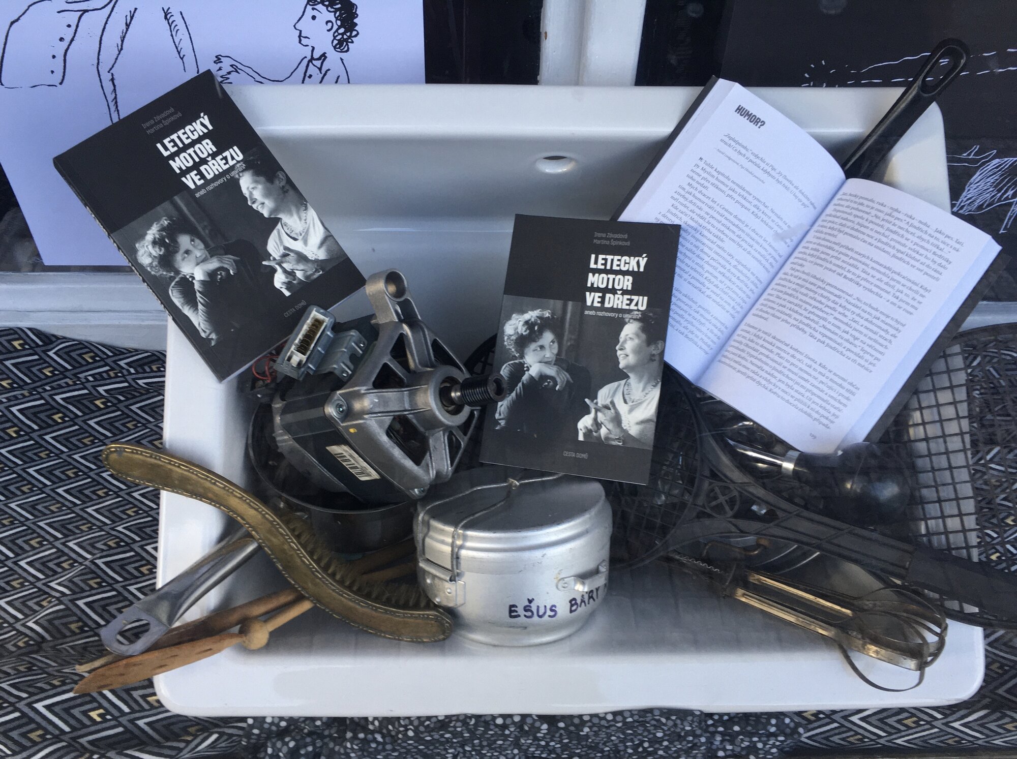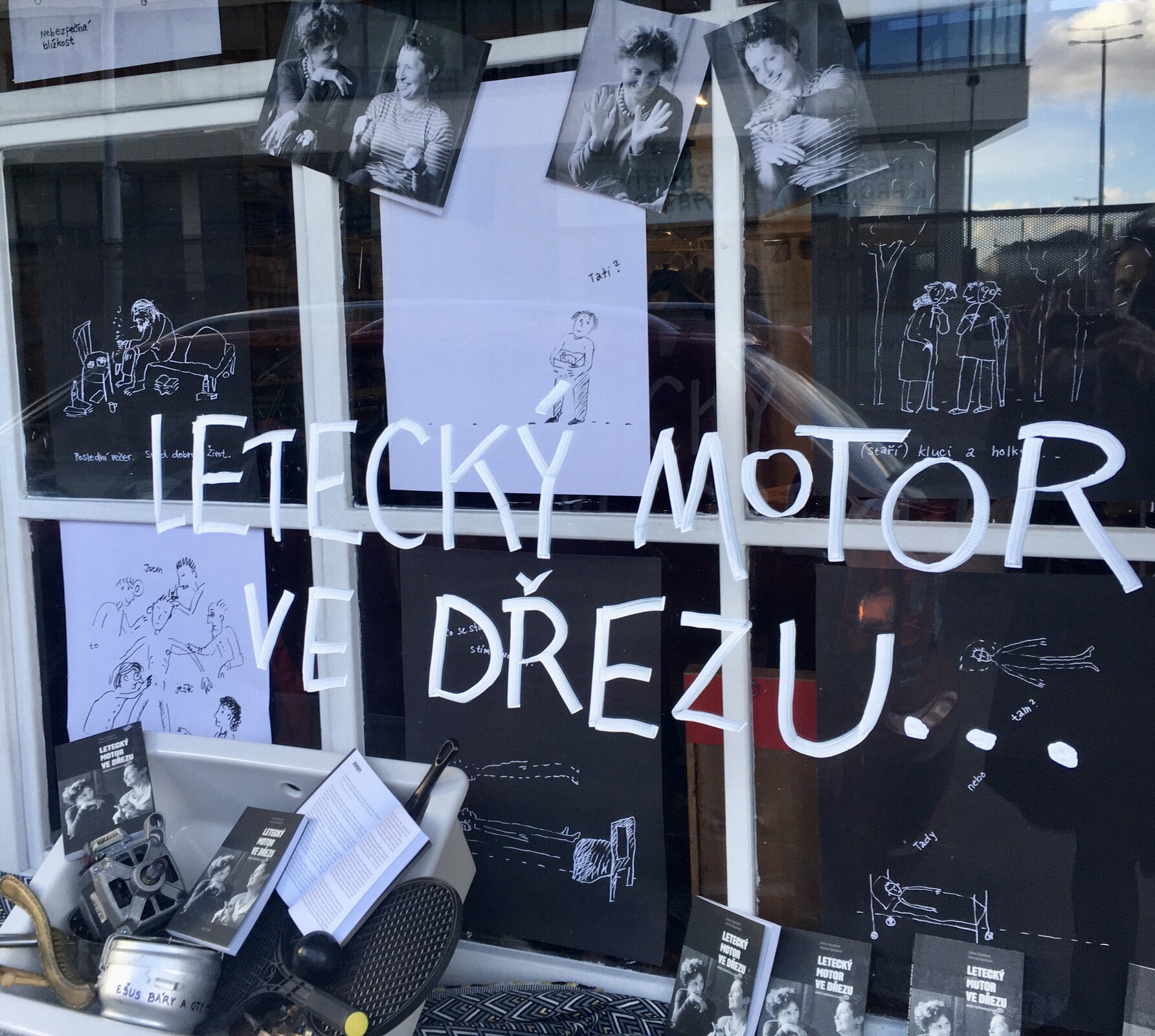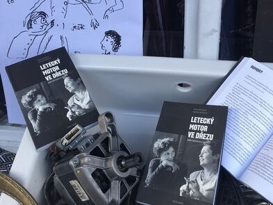 Ke knize Letecký motor ve dřezu vznikly tenké tužkové ilustrace a pak jsme vytvořily ke knize výlohu. Podívejte se, kdyžtak si v knize počtěte.